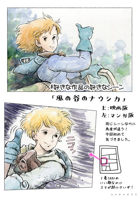 #好きな作品の好きなシーン 「風の谷のナウシカ」 腐海でパニクってるみんなを落ち着かせるために、マスクを外して笑う、この有名なこのシーンを描いてみる。 映画版もマンガ版もどっちも好き。 あれ?同じシーンなのに角度が違うぞ!? #コルクラボマンガ専科