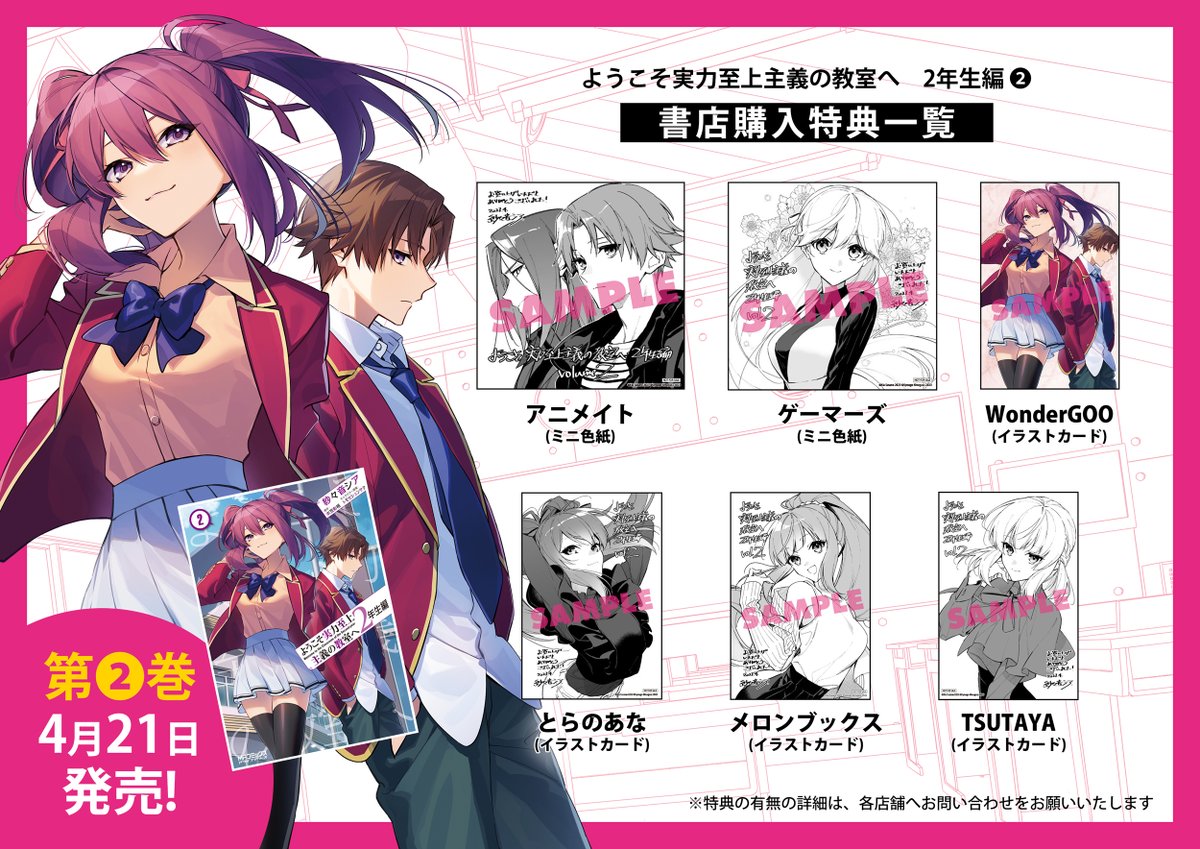 【4月21日(金)発売】 衣笠彰梧先生原作『ようこそ実力至上主義の教室へ 2年生編』コミカライズ2巻が4/21発売となります。 書店購入特典一覧です。 twitter.com/xia_hml/status…