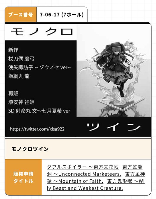 モノクロツイン、他の出し物です 埴安神 袿姫(再販) 20000円 杖刀偶 磨弓(準新作)12000円 射命丸文 (再販)4000円 何気に全てWFでの販売は初だったりします こちらもよろしくお願いします! #WF2022s #東方Project