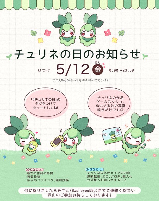 184 516 【 #チュリネの日 開催します!🌱】 5/12を #チュリネの日 として、イラストや色んな作品でお祝いしよう!という企画です🌷 画像の内容を読んでもらって、たくさんの方とチュリネちゃんでわいわいできる一日にしたいです〜! 何卒よろしくお願いします!!✨ 23/04/23 20:06