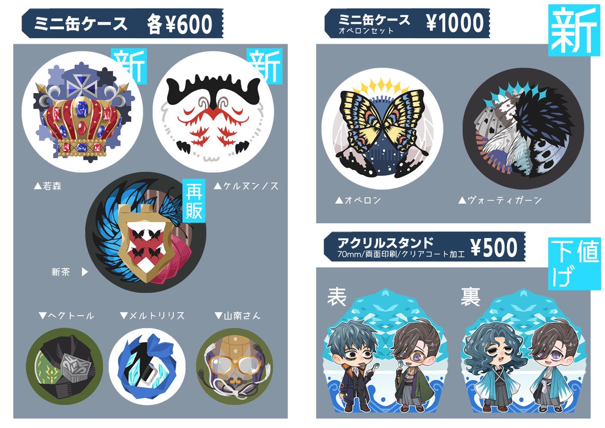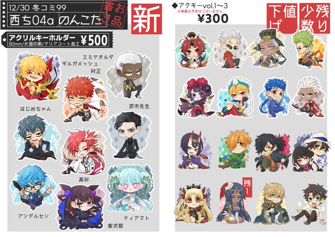✨12/30 冬コミ99 お品書き✨ ◆のんこた◆西ち04a◆ 新作はアクキー9種、ミニ缶ケース2種、小物3種。 ぽち袋はイベントでは初出しのものが14種の全64種です。 当日はお気を付けてお越し下さい、よろしくお願いいたします! #C99