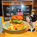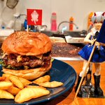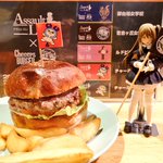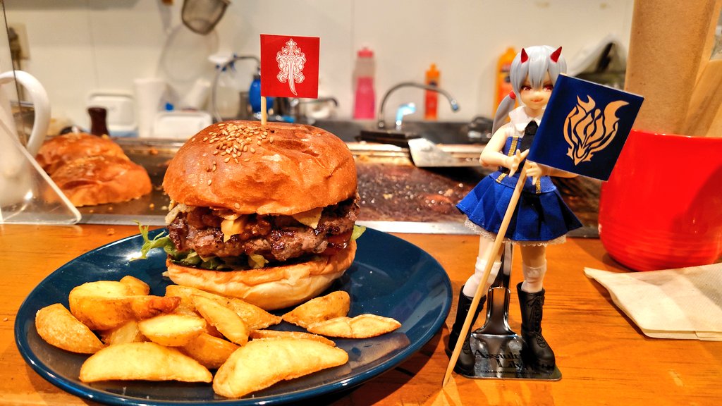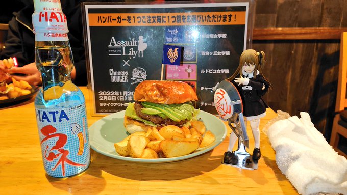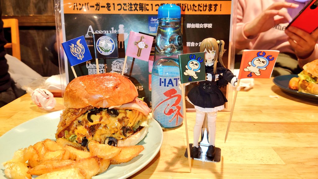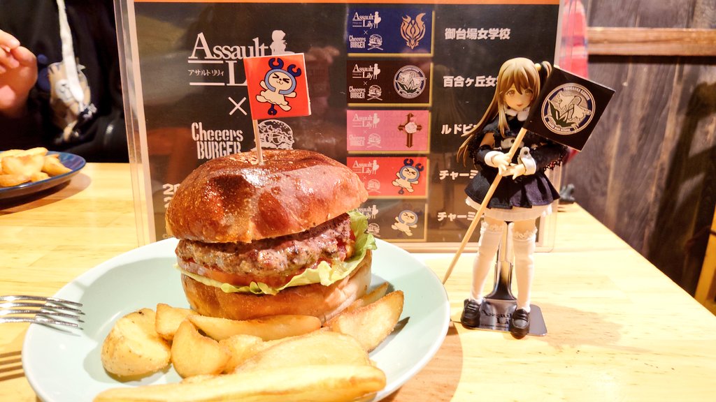 本日も郭神琳! 「アサルトリリィ×CheeersBURGERのコラボ」に出撃ですわ‼️ さて…美味しくいただきますわ❤️ 今日は百合ヶ丘の旗で応援ですか🐢 フレーフレー #アサルト舞台LM フレフレ舞台‼️ #アサルトリリィ #アサルトリリィドール部