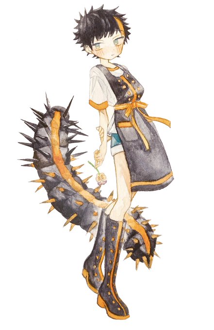 13 63 ツマグロヒョウモン(幼虫) タテハチョウ科に属するチョウの一種 スミレや園芸種のビオラ、パンジーなどを食べる 派手な見た目だが、こう見えて毒はない 使用画材:ホワイトワトソン・透明水彩・絵墨 #擬人化 #イラスト #アナログイラスト #水彩 #ツマグロヒョウモン 21/08/19 19:30