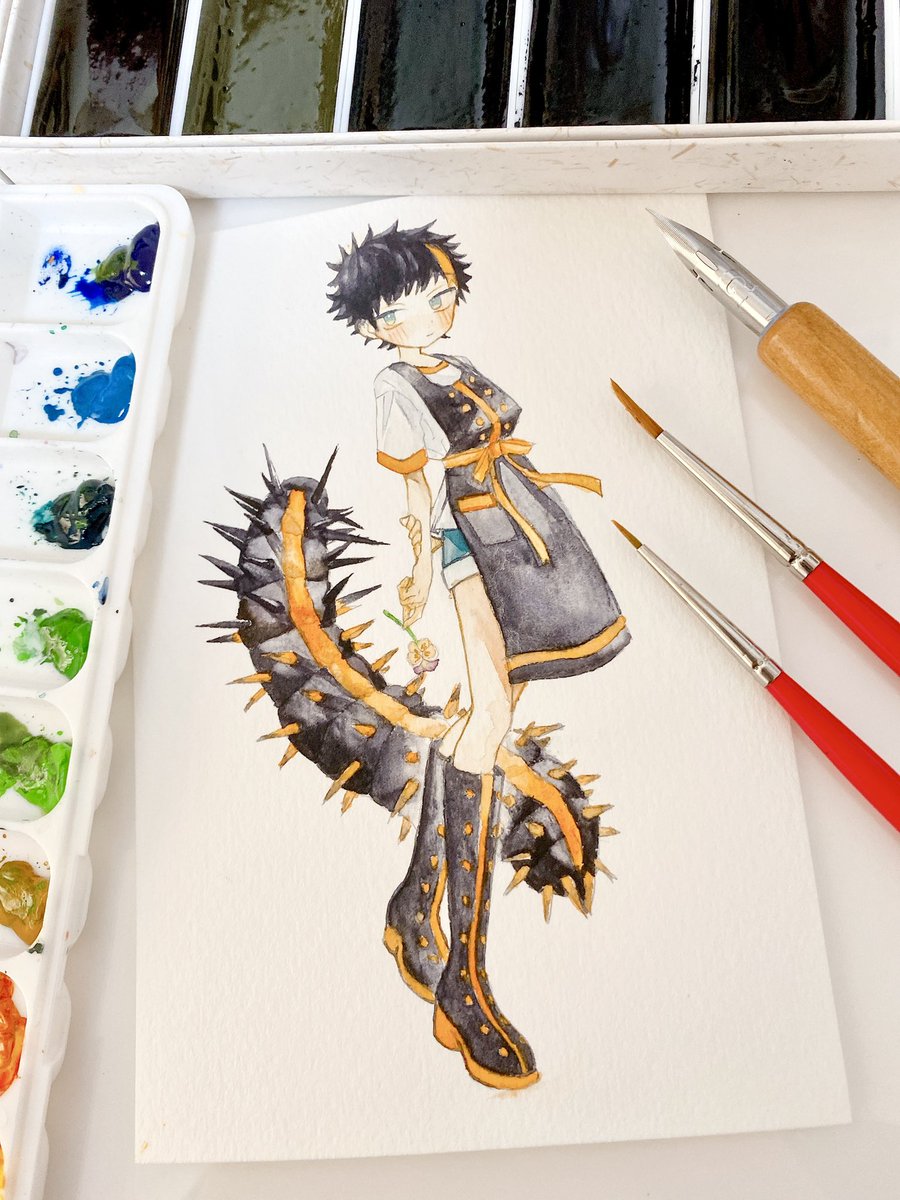ツマグロヒョウモン(幼虫) タテハチョウ科に属するチョウの一種 スミレや園芸種のビオラ、パンジーなどを食べる 派手な見た目だが、こう見えて毒はない 使用画材:ホワイトワトソン・透明水彩・絵墨 #擬人化 #イラスト #アナログイラスト #水彩 #ツマグロヒョウモン