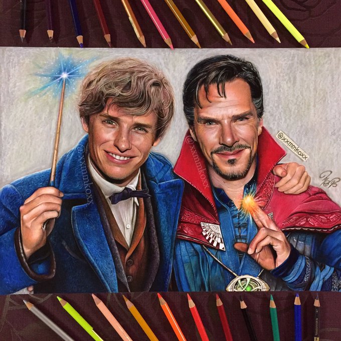 別世界の魔法使い同士で記念撮影!っぽくニュートとストレンジ先生を描いてみた✍️ #色鉛筆 #ファンタビ #ドクターストレンジ 進行動画→youtu.be/seVVfl-ASGM #EddieRedmayne #BenedictCumberbatch