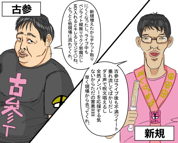古参と新規がそんな”認め合う関係性”な訳ないでしょうが…。ということで現実はこれです。 そもそも古参新規関係なく今現場に通ってる奴が正義。 #アイドルヲタク図鑑 #番外編 twitter.com/ys1th8ft2txt/s…