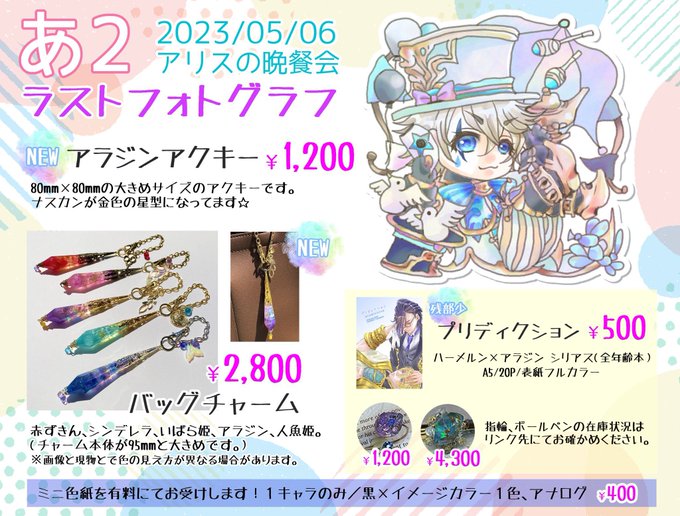 🚩シノアリスWebオンリーイベント🚩 🍴アリスの晩餐会🍴2023/5/6のお品書きです! ピエロアラジンのアクキーとバッグチャームが今回の新作です。 今回からスケブはなくてしてお好きなキャラをひとり色紙に描きます!よろしくお願いします!! #アリスの晩餐会 pictsquare.net/ntkldndh0c6q9v…