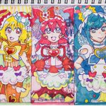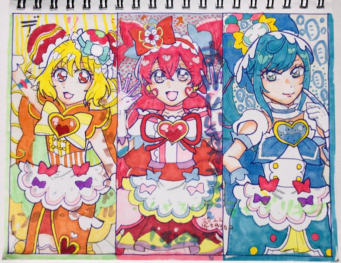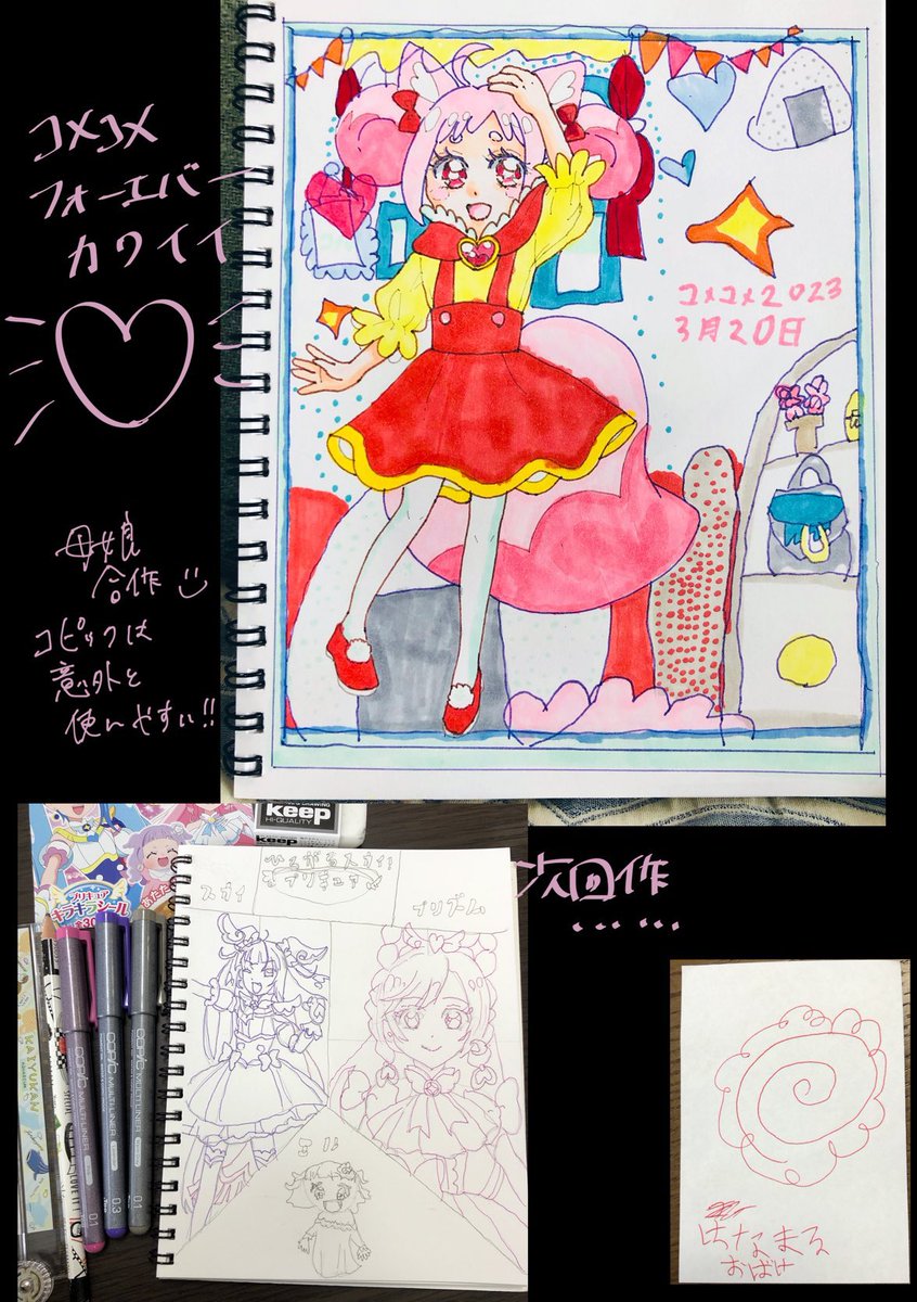 #precure #デリシャスパーティープリキュア 🍜🍙🥪 母娘合作、完成🙌 構図・ポーズ・着色・文字:娘 線画:私 1枚目は自然光撮影でほぼ現物カラー、2枚目はネオン風レトロ加工📸 #コピック 頑張ったので通りすがりにでも誉めていただけると喜びます😇 漢字結構読めます!