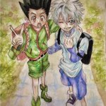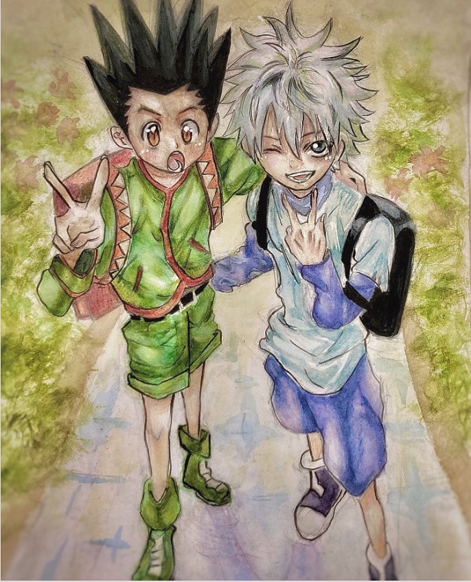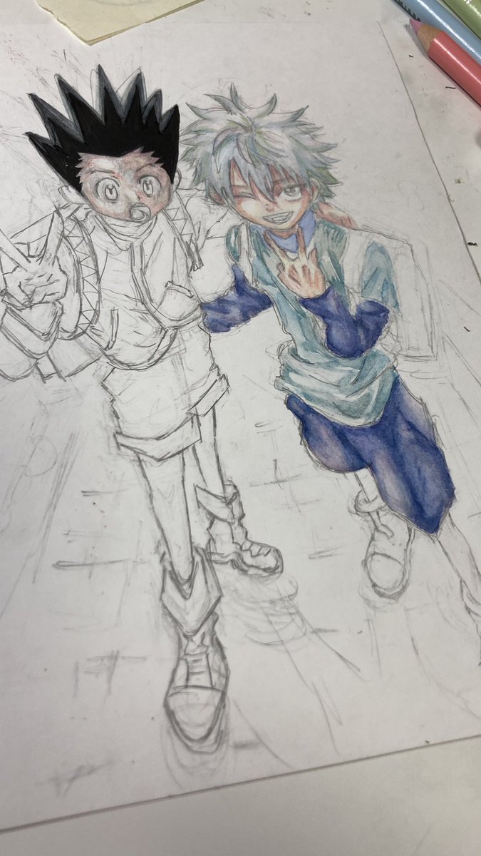 下書きうまくいかなくて三日間かかったやつ😹服の皺グラデ楽しかった! #ハンターハンター #キルア #ゴン #イラスト #水彩 #色鉛筆