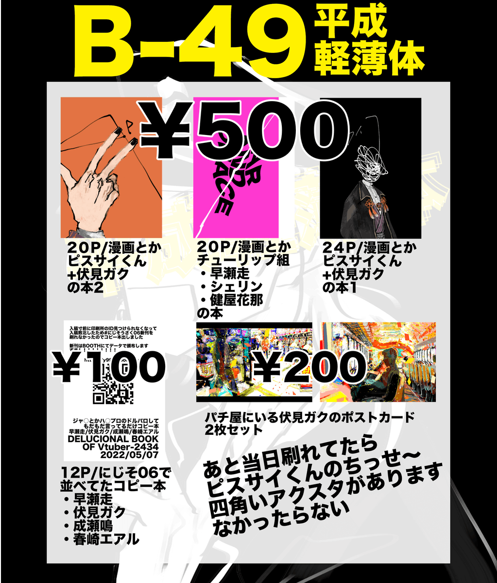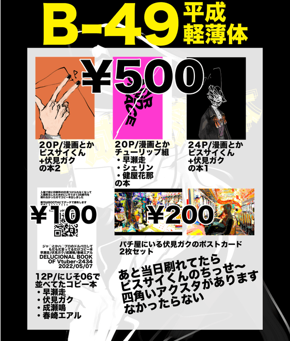 5/5 #にじそうさく07 B - 49 平成軽薄体 ピースサインくん+伏見ガクの本 チューリップ組の本 刷りたかったので刷ったパチ屋絵のポストカード あとなんかあります 明日お品書き作ります