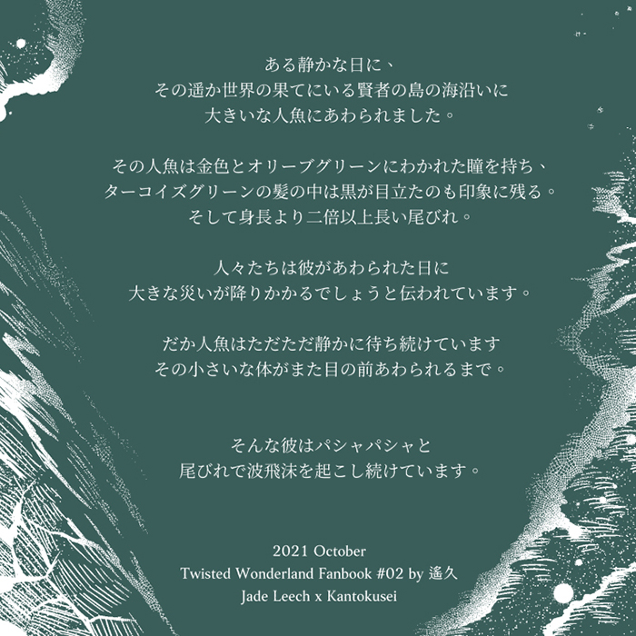 ジェイ監♀ 「海と陸にあなたがいない」(1/7) 10月台湾で頒布したジェイ監の本「沒有你的海洋與陸地」、今回クルミさん(@kurumi7660hc)に委ねて訳しますので、物騒くんと論外くん②当日で公開しました。 #twstプラス #twst夢