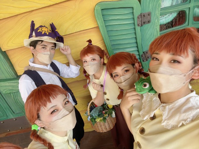 晴れたよ☀️ 本日はラプンツェルの髪の毛結ぶ町娘4姉妹と旗売り少年🚩 ラプンツェル仮装民さん!よろしくお願いします〜!!!! #Dハロ仮装2022 #Dハロ仮装 #Tangled