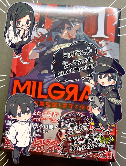 115 436 【告知‼️】 07.24発売‼️ 『MILGRAM 実験監獄と看守の少女』コミックス第1巻が発売です! アニメイト様購入特典で描き下ろしイラストカードが付いてきます! 更に、同時発売の 小説 『MILGRAM2 正当な善なる殺人』 を一緒に購入すると、山中さん描き下ろしSSの豪華特典が付いてきます! #ミルグラム 23/07/23 19:18