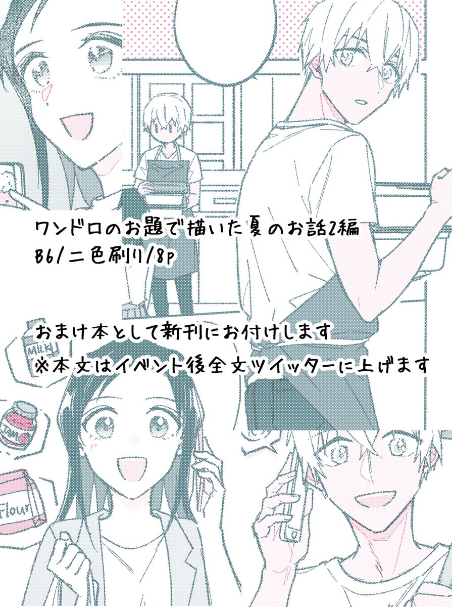 39 318 新刊お求めの方にノベルティとしてこちらのおまけ本をおつけします レトロ印刷さんの二色刷りB6本(8p)です あむあずワンドロライさんのお題から想起した夏のあむあず2編入り 1hourを軽く超えてるのでタグなしでイベント後に全編ツイッターに上げます 22/09/13 21:11