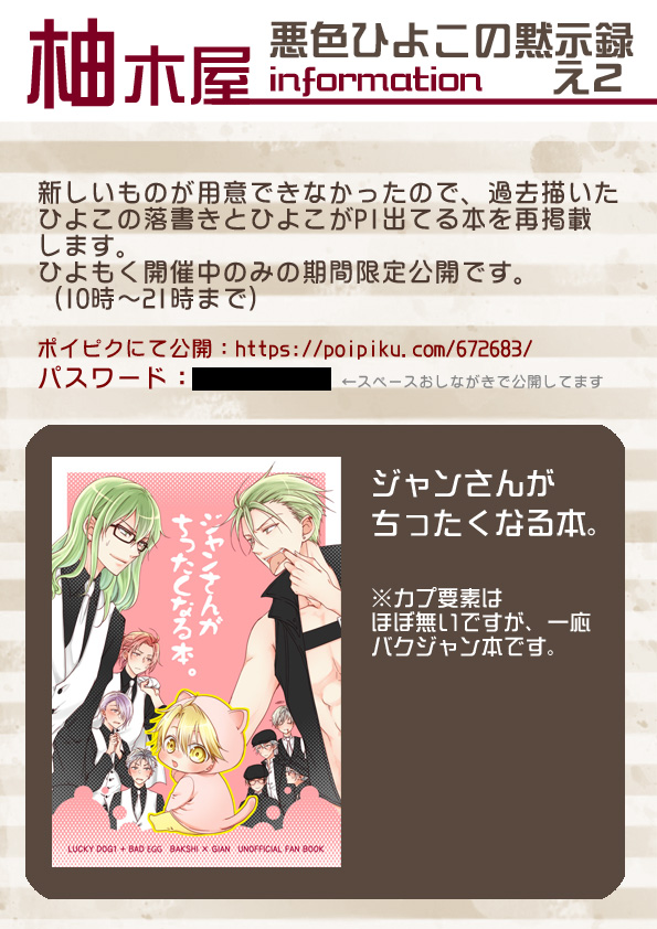 2 2 ひよもくおしながき…! 過去作まとめたら落書きしかなくて絶望したので、ひよこがP1だけ出てる過去本も公開しておきます…。 イベント開催中のみ限定公開設定にしておきました。イベスペのおしながきより、パスワード入手して閲覧してください。※現在は非公開です。 #ひよもく2023 23/02/19 02:36