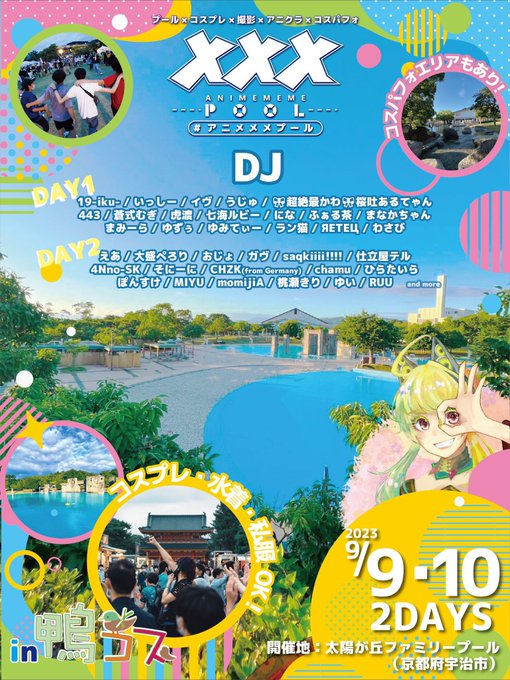 #アニメメメプール in #鴨コス 9/9(土)・10(日)2days開催🎊 10:00~19:30 @太陽が丘ファミリープール(宇治市) プール×DJ×コスパフォ×撮影が楽しめちゃう最高イベント!私は1日目に出演させて頂きます✨ぜひ一緒に水着やコスプレで楽しみましょう!お待ちしてます✨ 詳細🔍 animememe.net/pool2023 twitter.com/animememekyoto…
