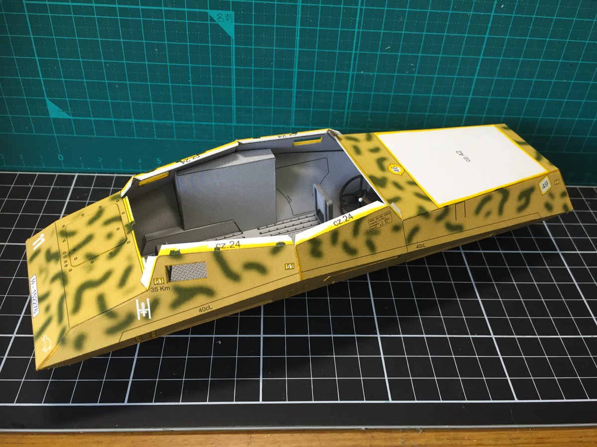 1 12 側面同士の接合は無理やり合わせた上にカッチョよくなってきたんでご機嫌で手に持ちまくってダメージでちょっと汚くなってしまったのです。とほほん あと、車内もそろそろ見納め #ペーパークラフト #カードモデル 22/09/22 20:59
