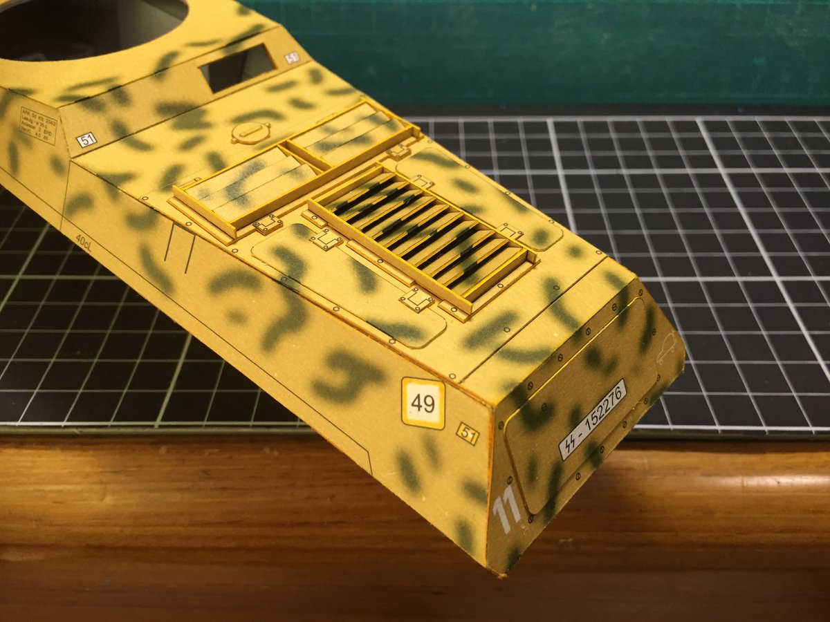3 28 MODELIK Sdkfz 234/2 PUMA 車体後部のデッキ上面を組み立てたのです ルーバーはちょいと面倒だけど完成すると見栄えがするんでけっこう好きだったり この後はサスペンションの組み立てで、8輪だから8回づつ繰り返しで進んでくんで進捗遅くなると思いますー #ペーパークラフト #カードモデル 22/10/05 23:01