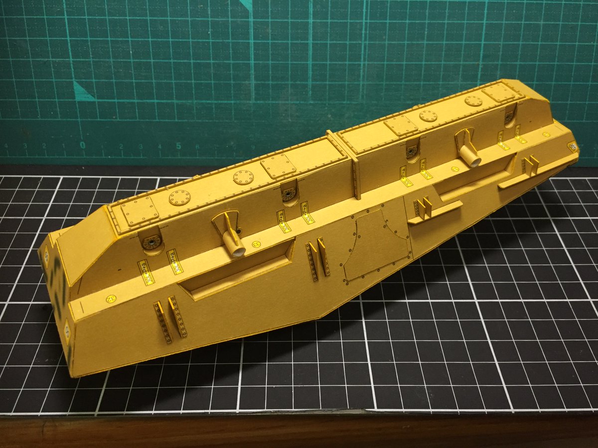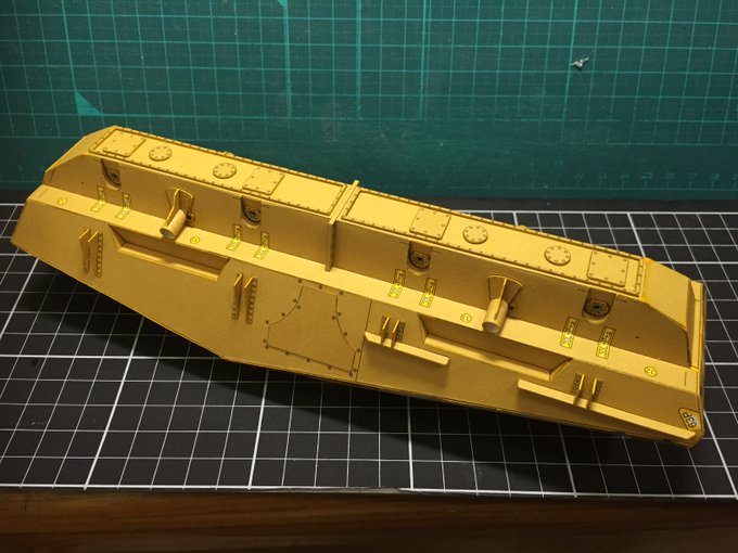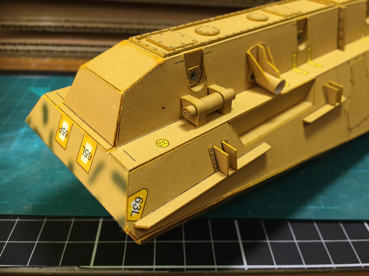 あとは印刷面がちょっと弱くて、擦ると色がハゲちゃうんでやや仕上がりが汚くなってしまったのは反省 つるんとしたテクスチャなので重厚感出したければ水彩絵の具でちょっと汚しを入れてもいいかも #ペーパークラフト #カードモデル