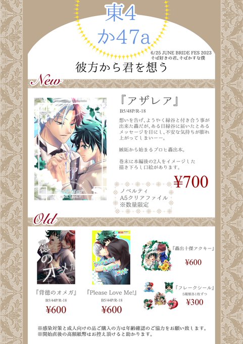 ✣6/25 そばそばJBお品書き✣ 新刊『アザレア』 会場限定でノベルティお渡し致します。 無配ペーパーもありますので宜しければご自由にお持ちください❤ サンプル…pixiv.net/artworks/10878… 🐯…ec.toranoana.jp/joshi_r/ec/ite… 当日、宜しくお願いします❤