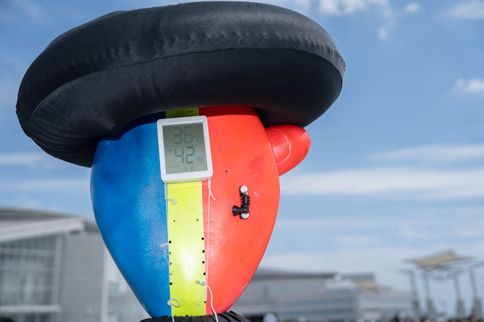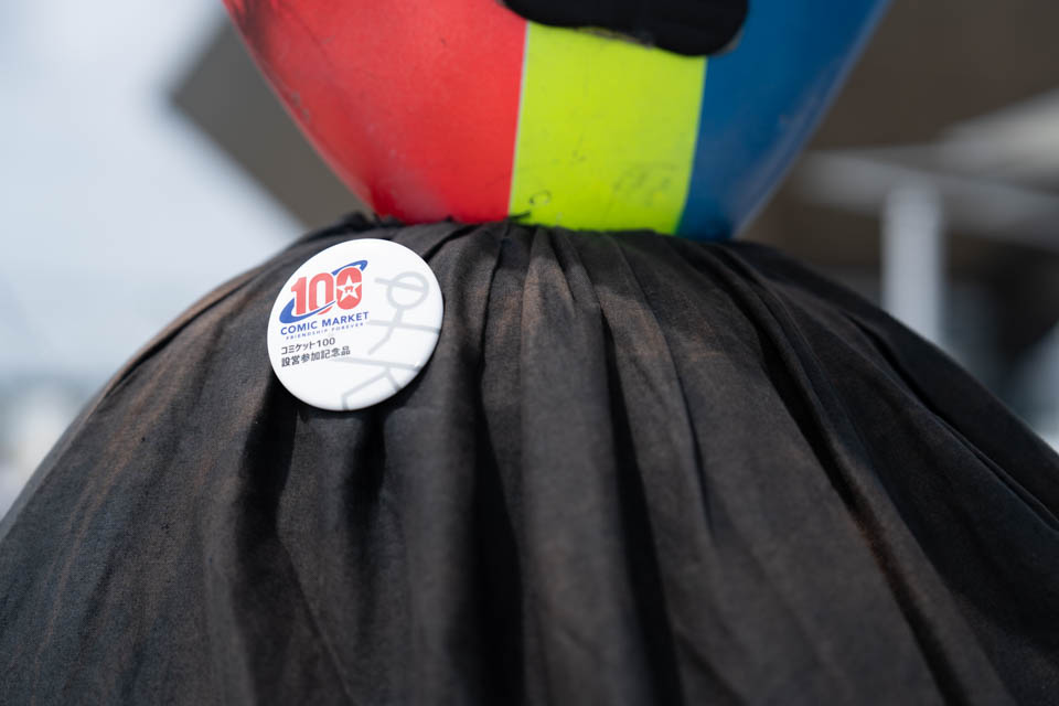 コミックマーケット100 2日目より シュールくん@expo_robot お久しぶりのコスプレエリアのランドマーク。 設営参加記念のバッジに温度計、たった1人で何という情報量なんでしょう(笑)! #コミックマーケット #コミックマーケット100 #CM100 #コスプレ