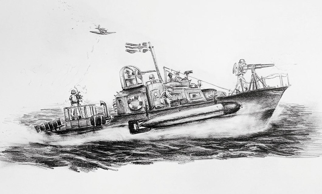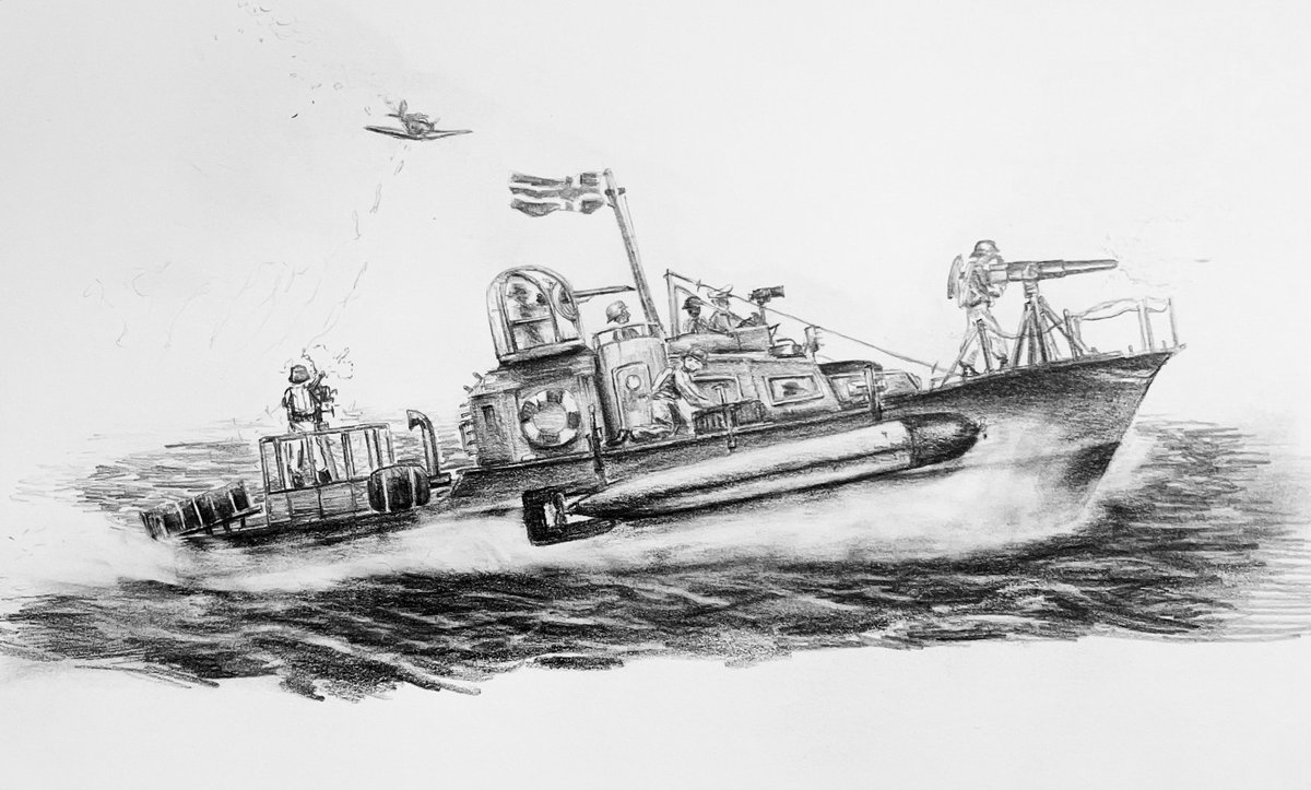 #夏の日本海軍祭り 昔描いた鉛筆画にAIで着色してもらったらいい感じになった。てかちゃんと飛行機と海として認識されてるのすごくない…?