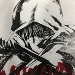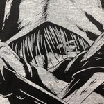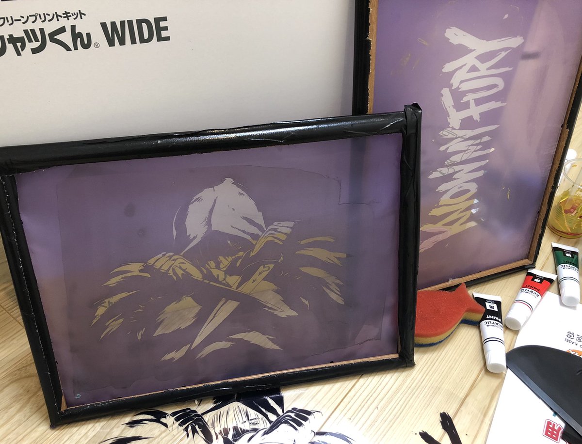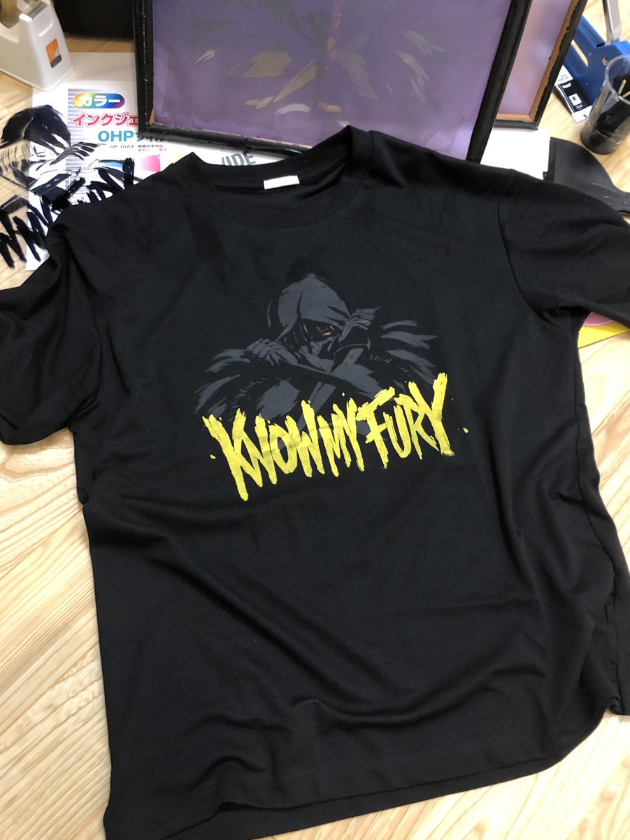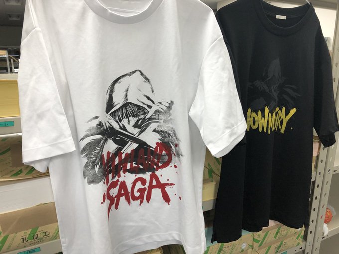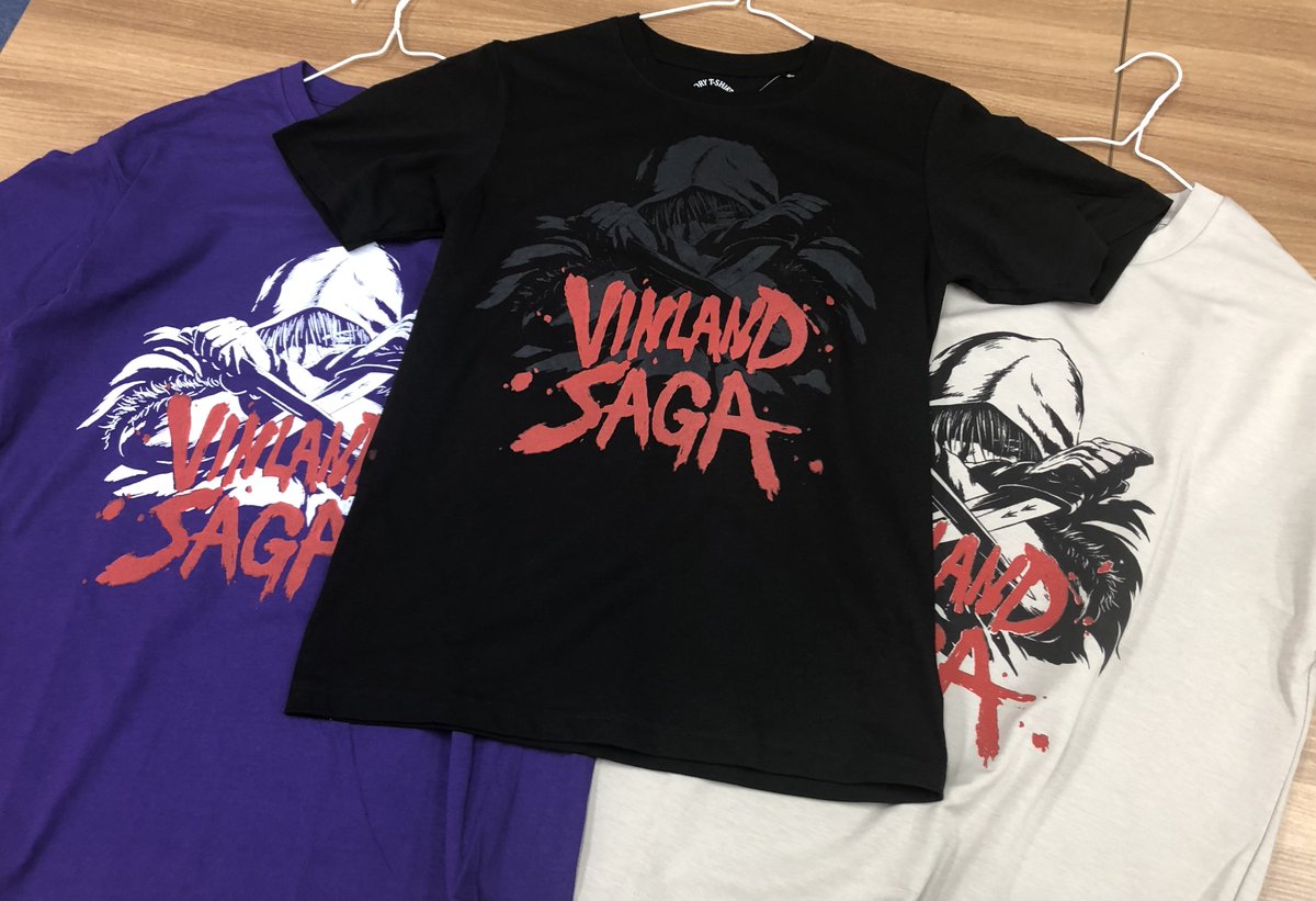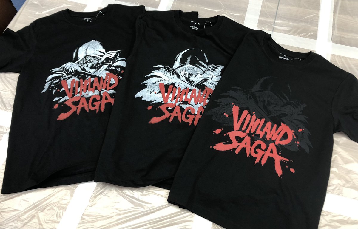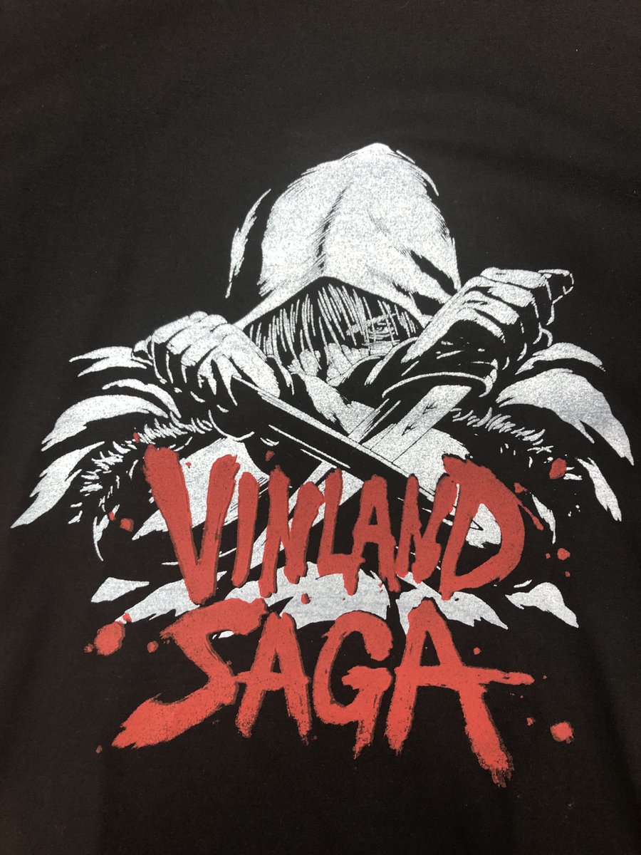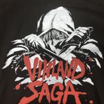 👕お待たせしました!ようやくTシャツ作り終了です! 中々成功しなかった黒地にグレーの影面プリントは結局4度目の原画修正を施して、ようやく及第点の仕上がりにできました( ̄▽ ̄;) 額に千発以上のタッカーをぶち込み、休日まで版作りを手伝ってくれた設定制作の荻田さんに感謝です😭 #VINLAND_SAGA