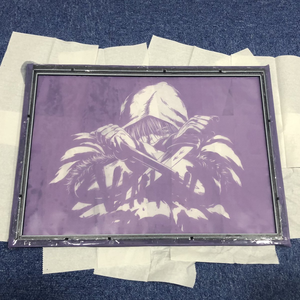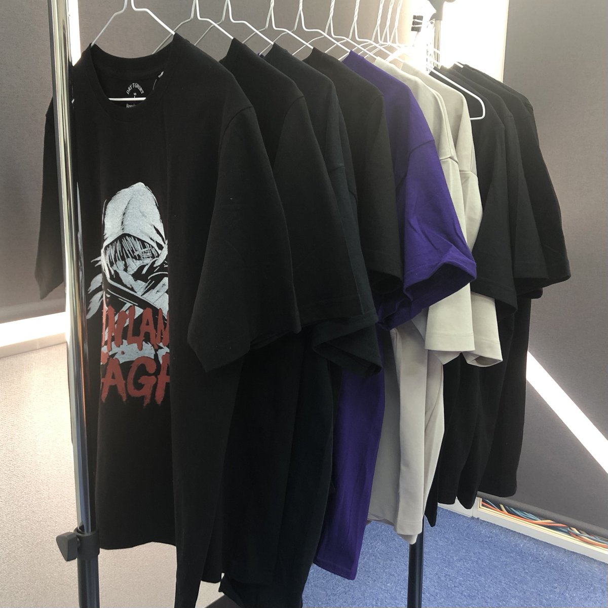 3枚リテイク中ですが、なんとか一通り予定の枚数を刷れました…!バリエーションでは紫が思ったより良い感じです(^-^) 発注したグレーのTシャツがヘザーではなく本当のグレーだったので、少しイメージと違うかもしれません!お待たせしてすみません、もう少しで発送できそうです! #VINLAND_SAGA
