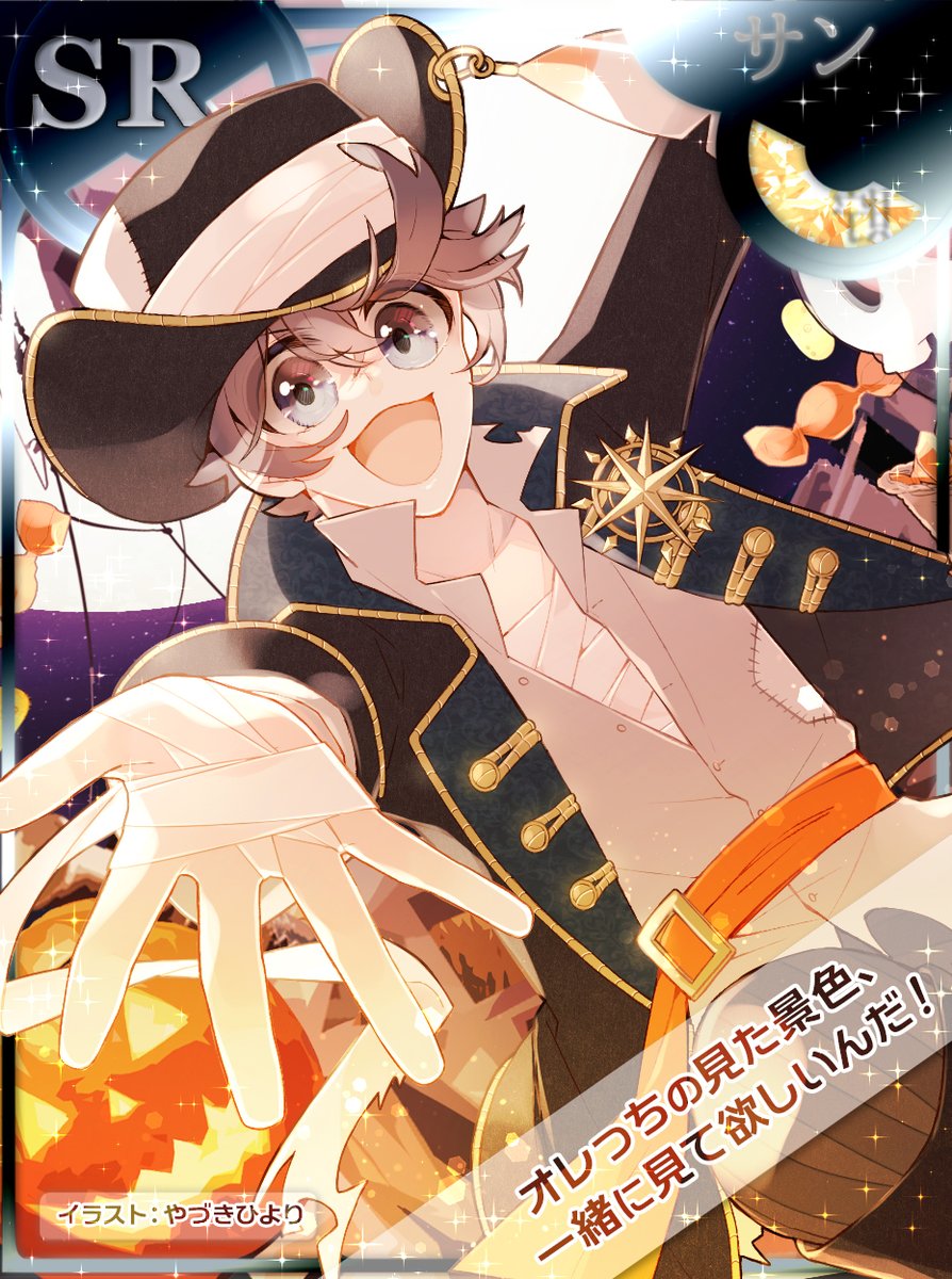🎃SR|サン(闇) #図鑑所有者ガチャ2021 幽霊海賊船の船長!という設定で描かせていただきました☠️キャラ指定おまかせにさせていただいていたのでサンくんだと分かった時は嬉しさと初描き大丈夫かな……?!の緊張ではしゃいでおりました😂衣装を考えたり表情差分や背景の作成、全部楽しかったです!