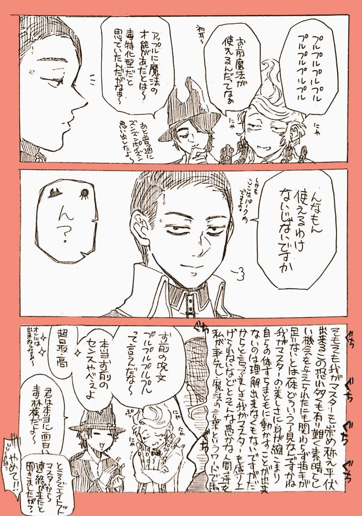 昔々描いたやつか出てきたので写植したらどうにか読めるようになったわ漫画。🍎😈🎩初年度顔合わせの時の話。