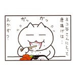 新・いつも腹ぺこ ネコ谷さん 「唐揚げ」1/2 お料理のレシピもお店の紹介も無い、 ネコ谷さんが飲食するだけの… なんちゃってグルメ漫画🍴 #漫画 #4コマ漫画 #猫 #グルメ #ネコ谷さん #漫画が読めるハッシュタグ #唐揚げ