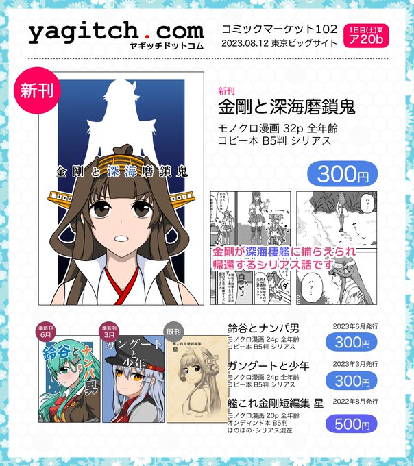 #C102 #C102お品書き C102お品書きです 新刊コピー本『金剛と深海磨鎖鬼』 6月発行コピー本『鈴谷とナンパ男』ほか 8/12(土) 1日目 東ア20b「yagitch .com」にてお待ちしています
