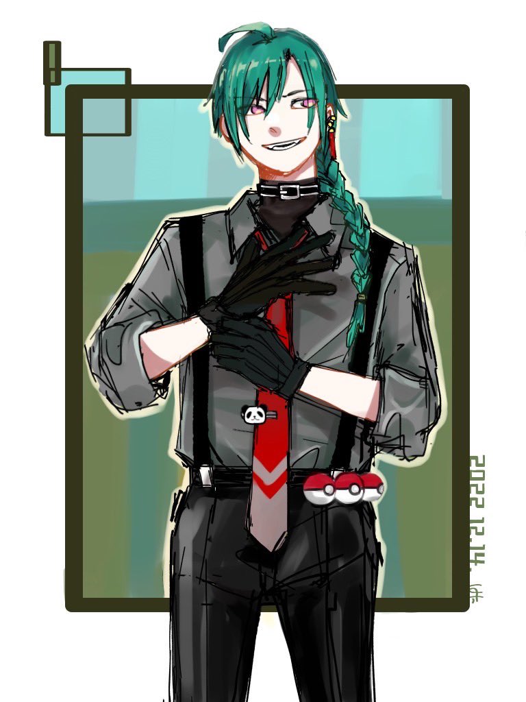 面接官緑仙を見たら、サスペンダー手袋を描きたい思いで頭が一杯になったんだ…課題なんて手につく訳がなかったんだ… 四天王の緑仙て字面がめちゃくちゃつよそう。勝てる気がしない #緑仙はやく見ろ