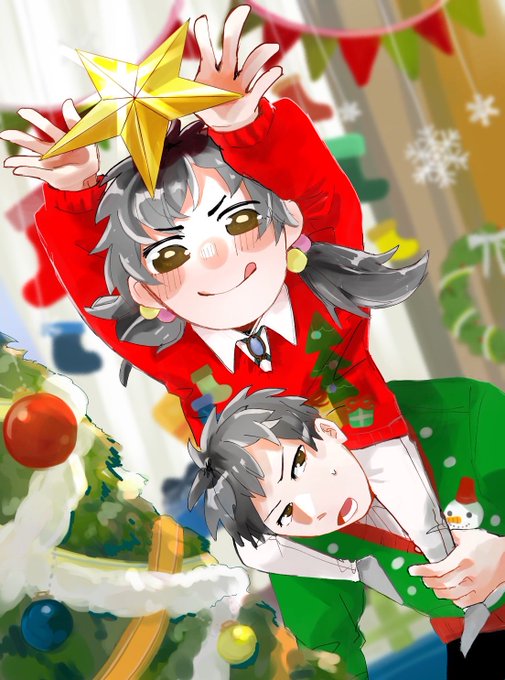 メリクリィ〜〜〜〜!!!!🎅 これは飾り付けしてる兄妹。母が作ったかわいいセーターも着てます #イラスト #クリスマスイラスト