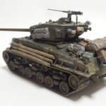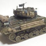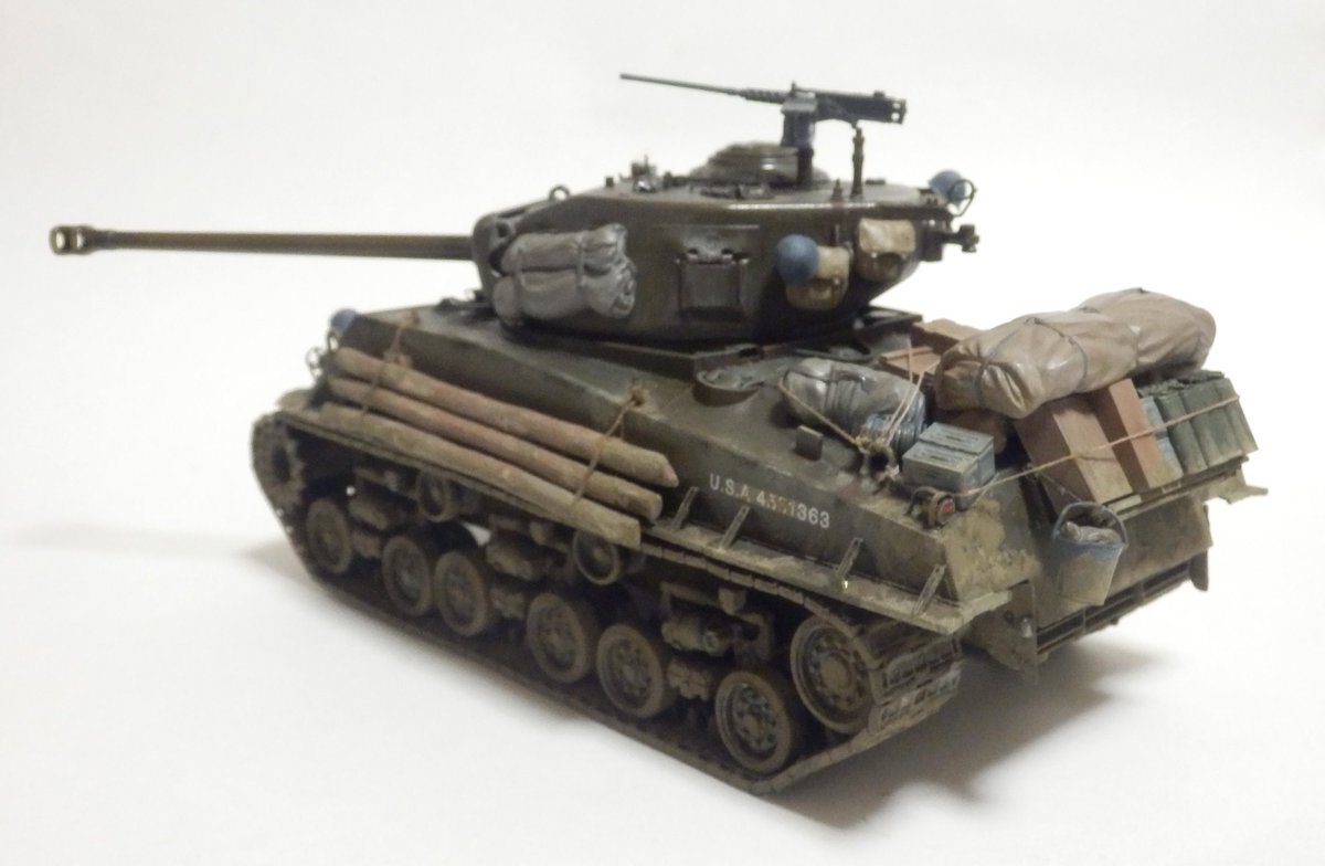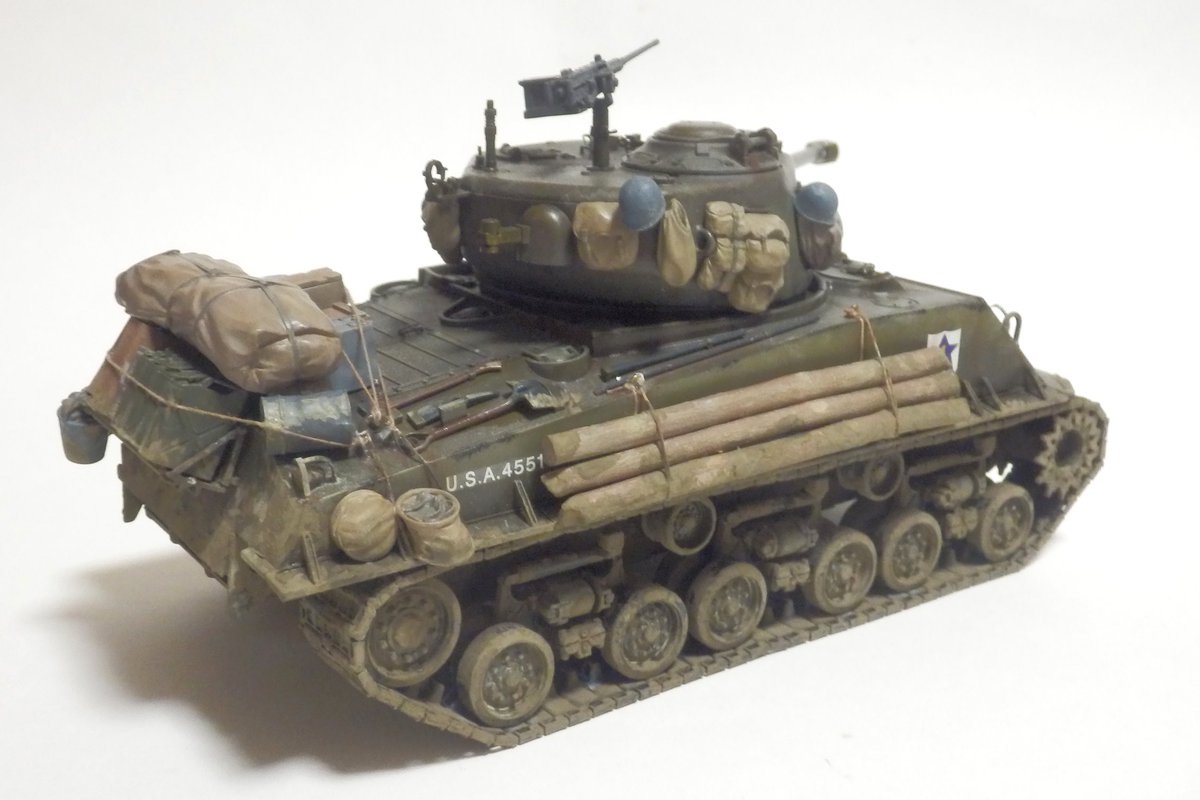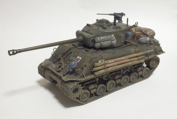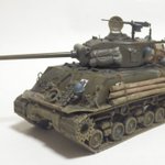 M4A3E8 完成であります サンダース大付属校の校章は遊び心で (この車輛自体 劇中には未登場) 車体側面の校章が見えなくなったのは想定済であります #モデラーさんたちがRTしてくれて新たなモデラーさんたちと繋がりたい #模型戦車道 #戦車模型 #今月作ったプラモ晒そうぜ