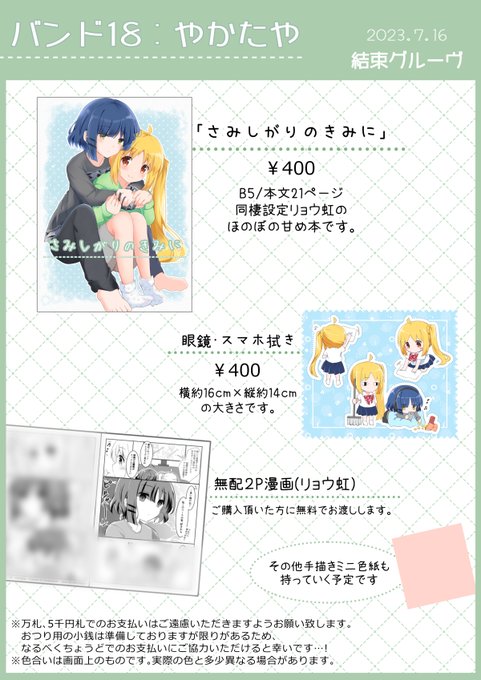24 59 遅くなりましたが明日の結束グルーヴのおしながきになります。スペースはバンド18になります。よろしくお願いいたします。 明日も暑くなりそうなので会場に来られる方はお気をつけてお越しください…! 23/07/15 11:07