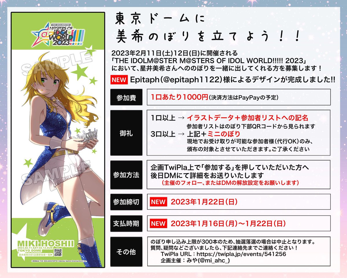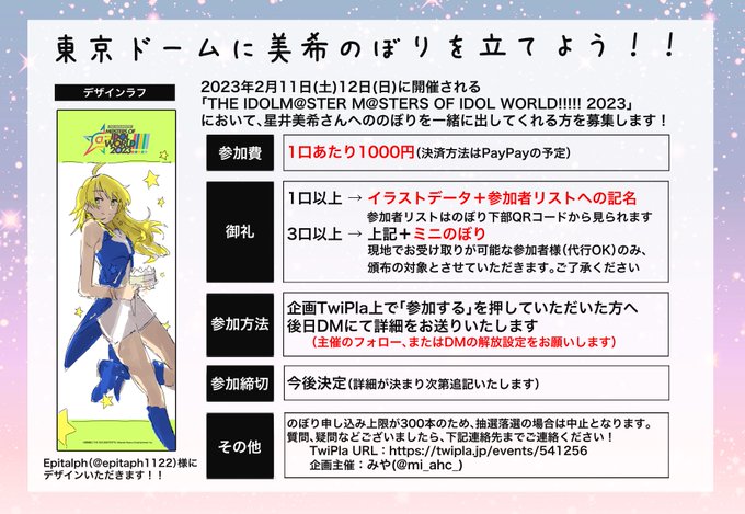 星井美希さんのぼり企画が進行中です!夢の東京ドームで、私達の最高のアイドルののぼりを共にプロデュースしませんか!? ご興味のあるハニーの皆様、TwiPlaへの参加表明お待ちしております!twipla.jp/events/541256 主催:みや様(@mi_ahc_) 、イラスト: Epitaph様(@epitaph1122) #アイマスMOIW2023 twitter.com/mi_ahc_/status…