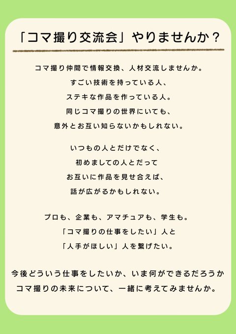 54 138 今、コマ撮りにおもしろい流れがきてる! この流れを消したくない、もっと盛り上げたい。 という気持ちから、こんな会をやってみたいけど、どうでしょうか?という企画書を書きました。 20/02/07 16:57