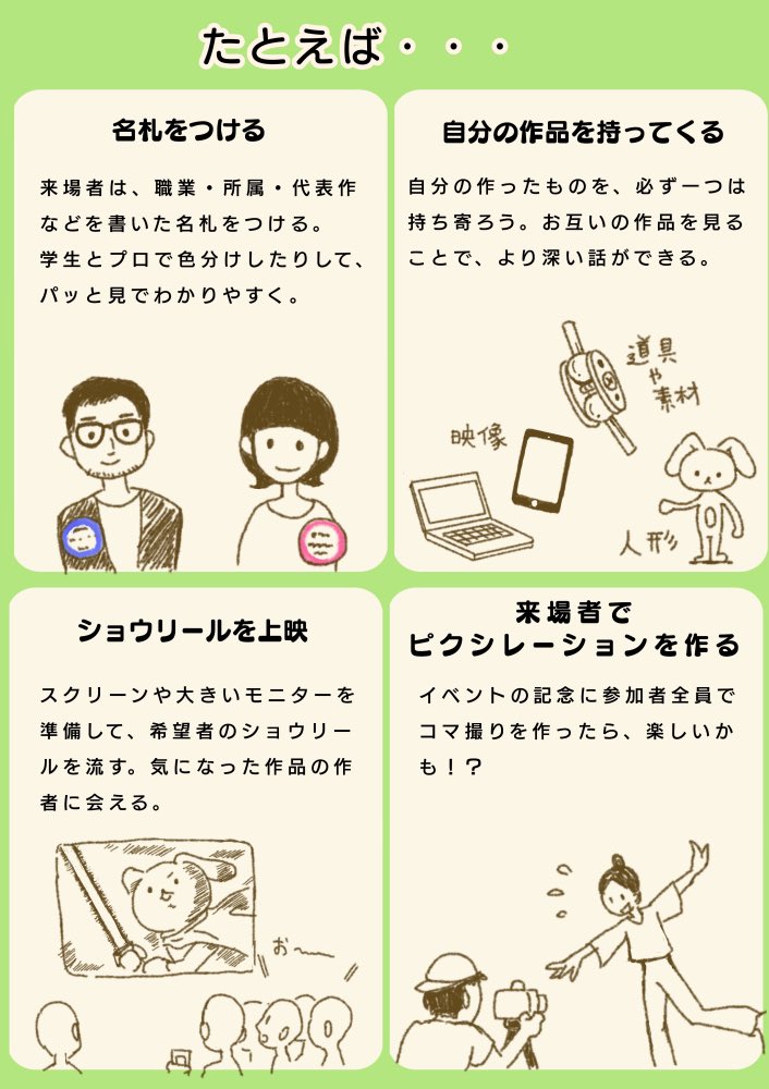 今、コマ撮りにおもしろい流れがきてる! この流れを消したくない、もっと盛り上げたい。 という気持ちから、こんな会をやってみたいけど、どうでしょうか?という企画書を書きました。