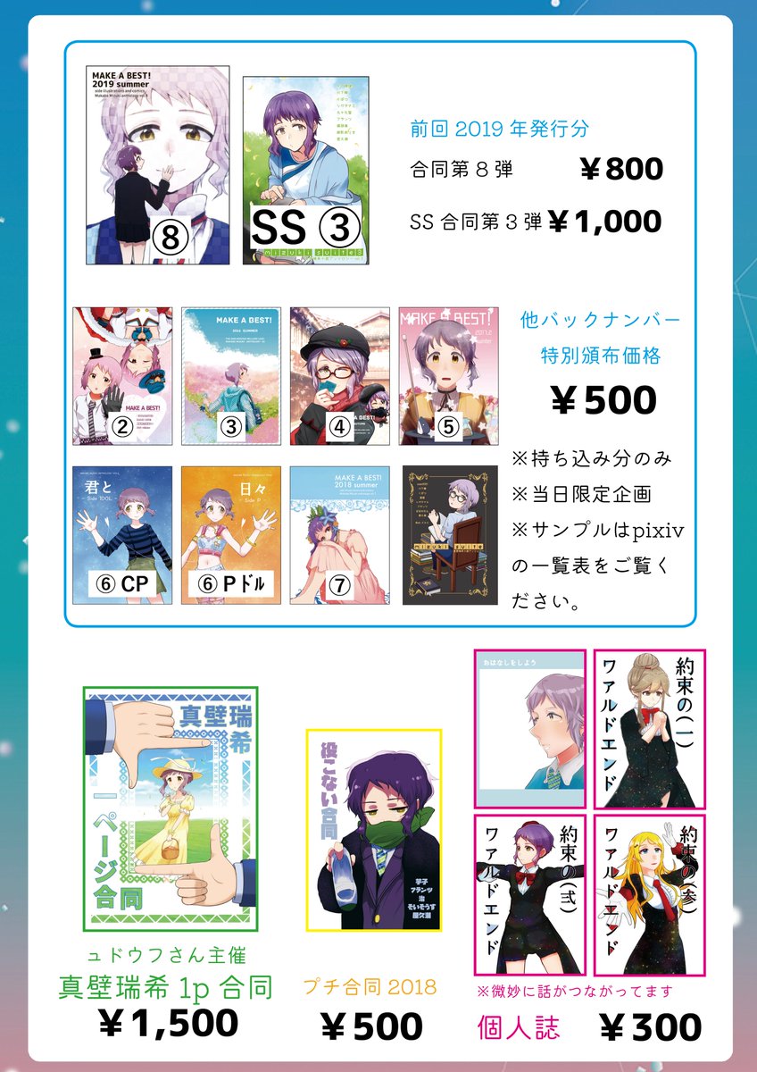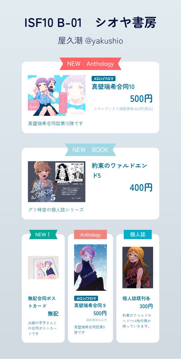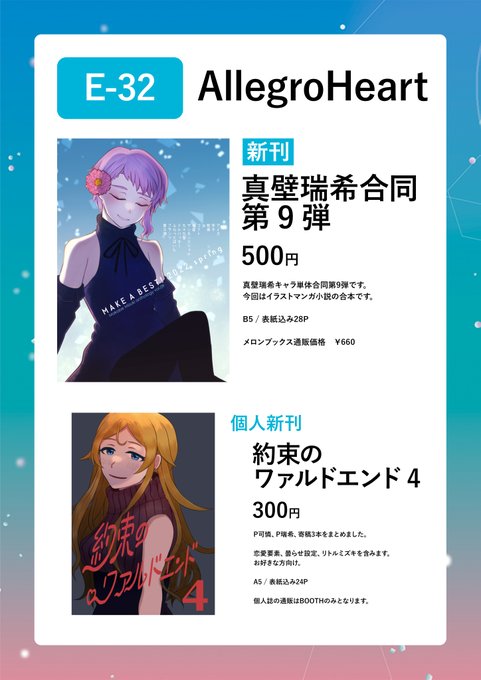 #ISF09 E-32 AllegroHeartおしながき【完成版】 新刊 pixiv.net/artworks/98422… 真壁瑞希合同誌 pixiv.net/artworks/98442… 真壁瑞希小説合同 pixiv.net/artworks/98442… 委託 ュドウフさん主催 真壁瑞希1P合同twitter.com/_Yudoufu/statu… 既刊合同:会場持ち込み分のみ¥500頒布 既刊個人誌:¥300に変更