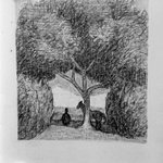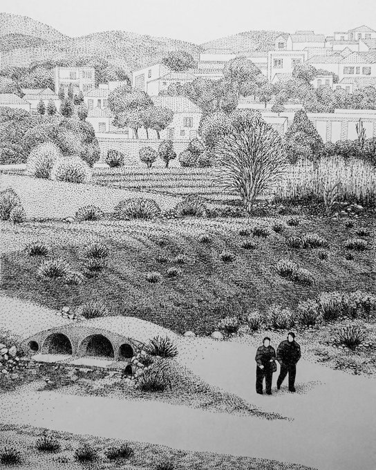 【田舎の町の小道】 木々に囲まれた田舎の町の、のどかな小道。 親子らしき二人が、話し込みながらのんびり歩いていました。 #illustration #drawing #artwork #イラスト #ドローイング #ボールペン #ペン画 #ボールペンイラスト #点描 #ballpointpen
