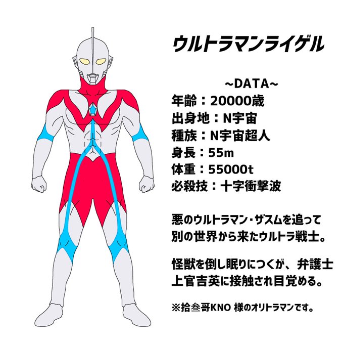 ウルトラマンライゲル / ULTRAMAN LEGEL 以前描かせていただいた、拾叁哥KNO( @knoshisange )様のオリトラマン、ライゲルを描き直させていただきました! #オリトラマン #よその子描かせてくださいキャンペーン