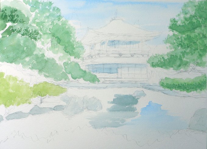 銀閣寺とりあえずここまで描きました。 他にやることがいろいろあるしこれは販売に回せるクオリティに仕上げたいので、もうちょっと落ち着いてからあらためて仕上げます。 #ストックイラスト用の絵描くよ6月3日 #アナログ絵