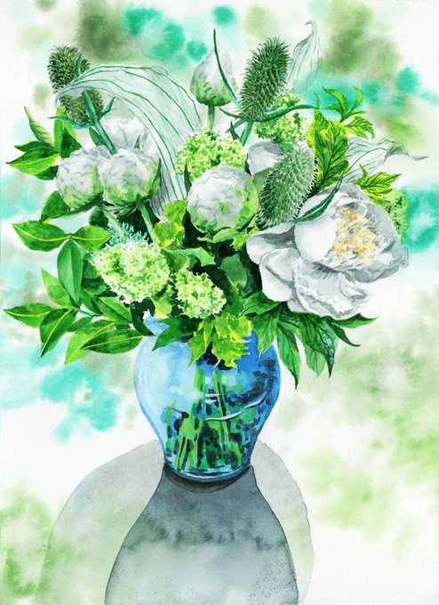 最終的にこうなりました。 昨日とだいぶ色が違いますがこれが原画に近いです。 白い花がメインだからあえて背景をうるさくしといたんだけど ここまでしなくてもよかったか(笑) でも描いてて楽しかった。 #ヤフオクに出品する絵描くよ6月11日 #アナログ絵