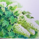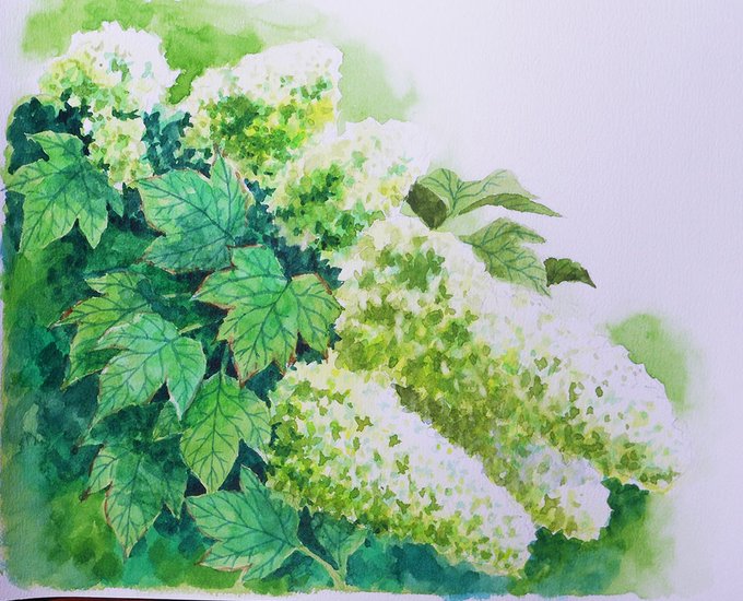 カシワバアジサイ完成。 これ、じつは「6月の記念日」を描いたのと同じ頃に描きかけてました。 今日はここまでにします。 お付き合いいただきありがとうございました。 #素材用の絵描くよ6月25日 #アナログ絵