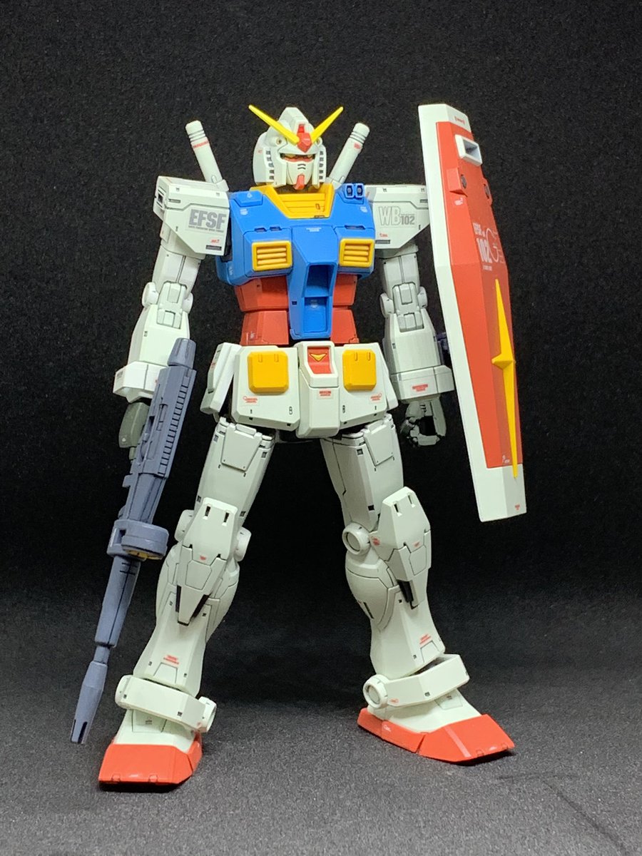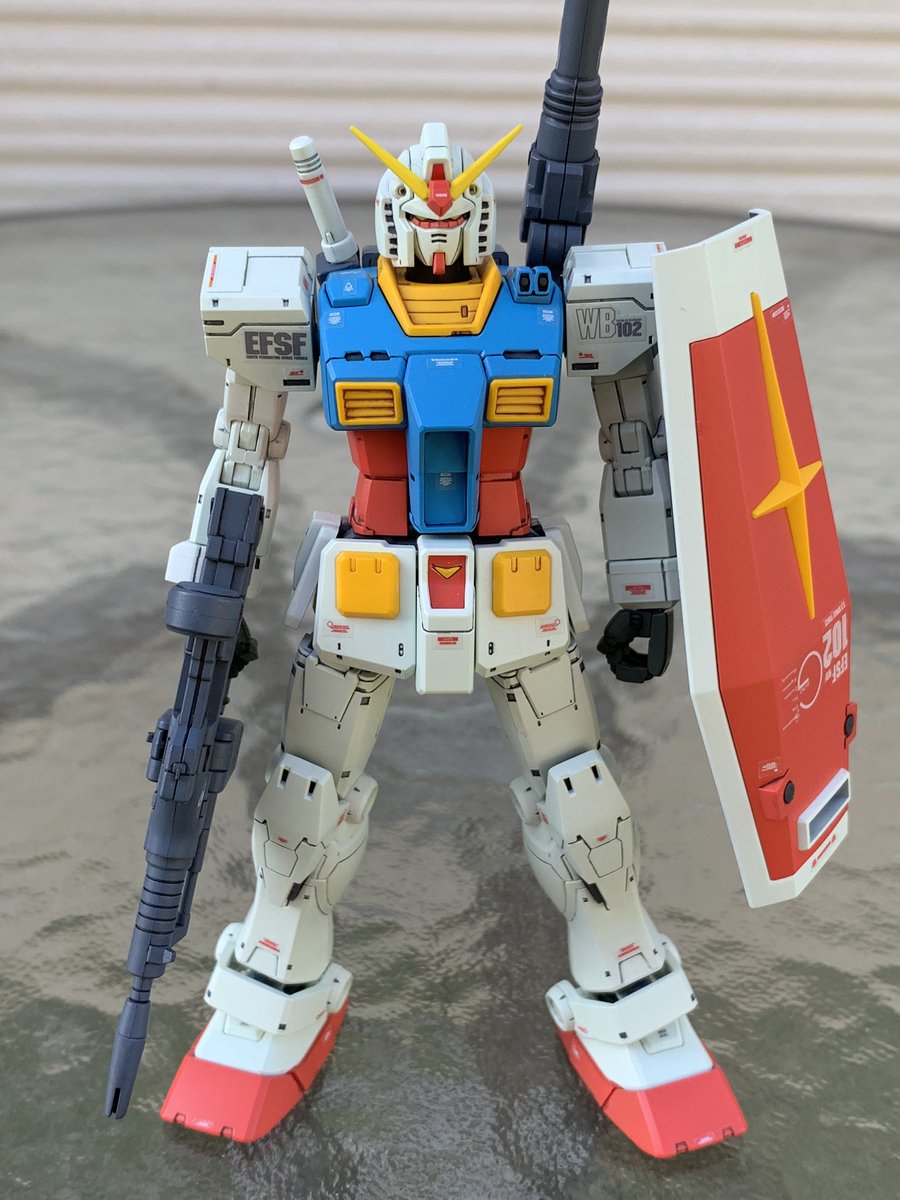 やっと完成しました1/144オリジンガンダム。墨入れの仕上がりが気になってしまって時間かかっちまったーい!素組みランナー塗装墨入れシール仕上げです。#ガンプラ