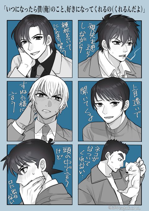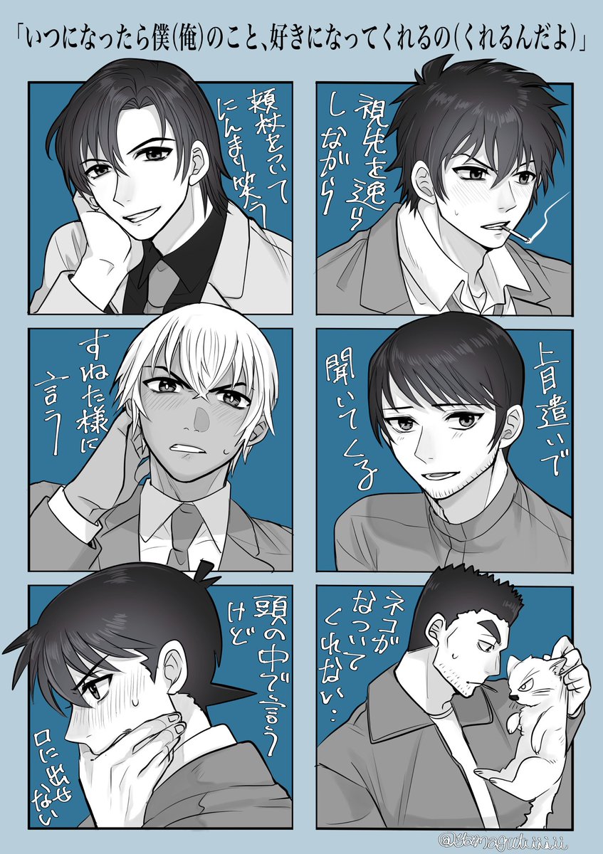 絢音さんのツイートに便乗して描きました。 「いつになったら僕(俺)のこと、好きになってくれるの(くれんだよ)」って言う警察学校組と新一くん。 相手いないけど、あむあず、新蘭、伊達ナタです。