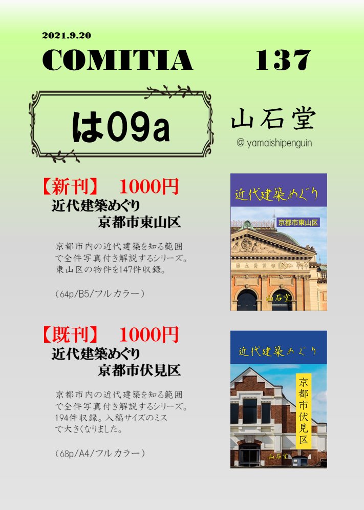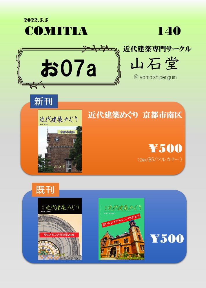 【告知】5月5日(木)にビックサイトにて開催されるコミティア140に山石堂(お07a)として参加します。多分唯一の近代建築サークルです。シリーズ新作の京都市南区編と、既刊を持って行きます。今回初のペーパーも用意するのでペーパーだけでも是非! #COMITIA140 #コミティア140
