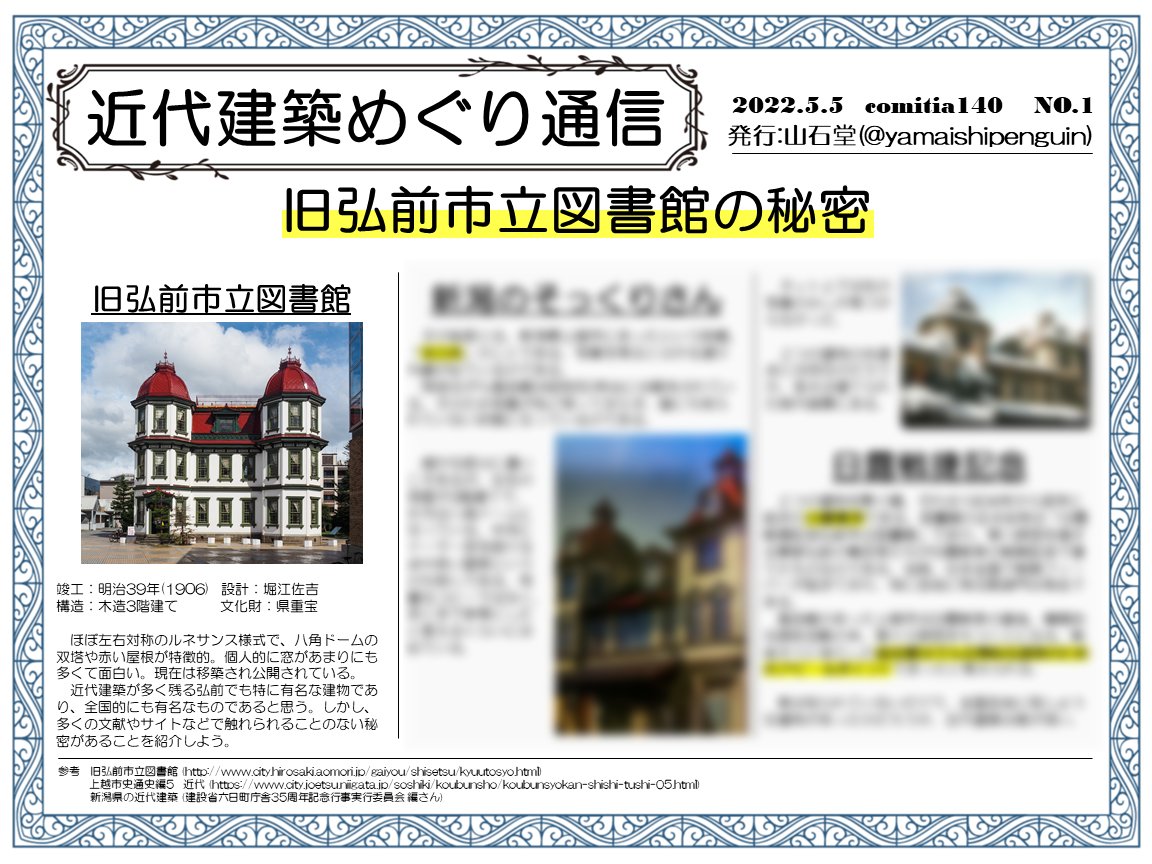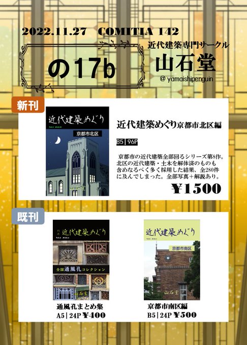 【告知】 遅くなりましたが #コミティア142 (11/27 東京ビックサイト)のお品書きです。近代建築専門サークルとして近代建築の底なしな魅力が伝わればと思います。街を見る目が変わるかも?南区本は残りの数部を持って行きます。半年ぶりのイベント&新刊で楽しみです。 #COMITIA142