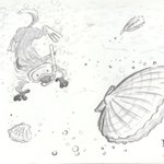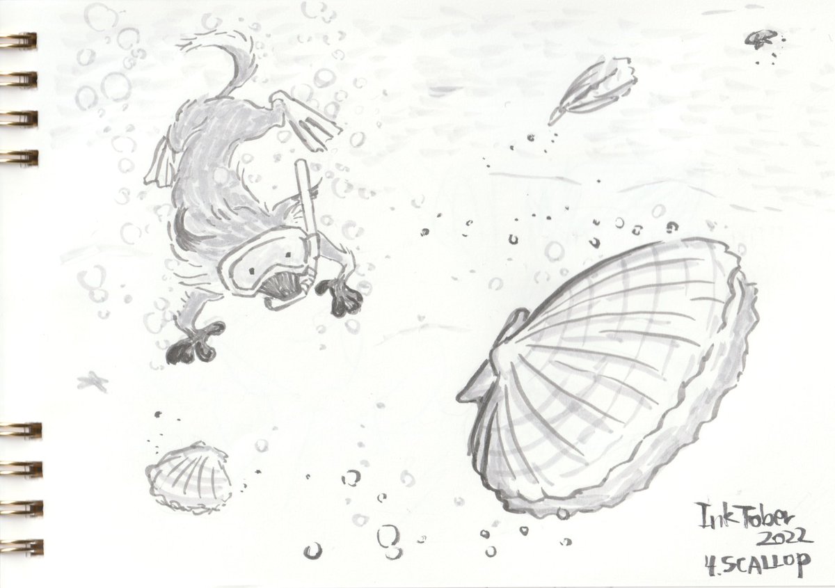 🦊くん旅の思い出。 ホタテ貝が泳ぐのを見たことあるんだって! 4.SCALLOP He saw scallops swimming! #inktober #inktober2022 #kuretake_inktober #kuretake_inktober2022